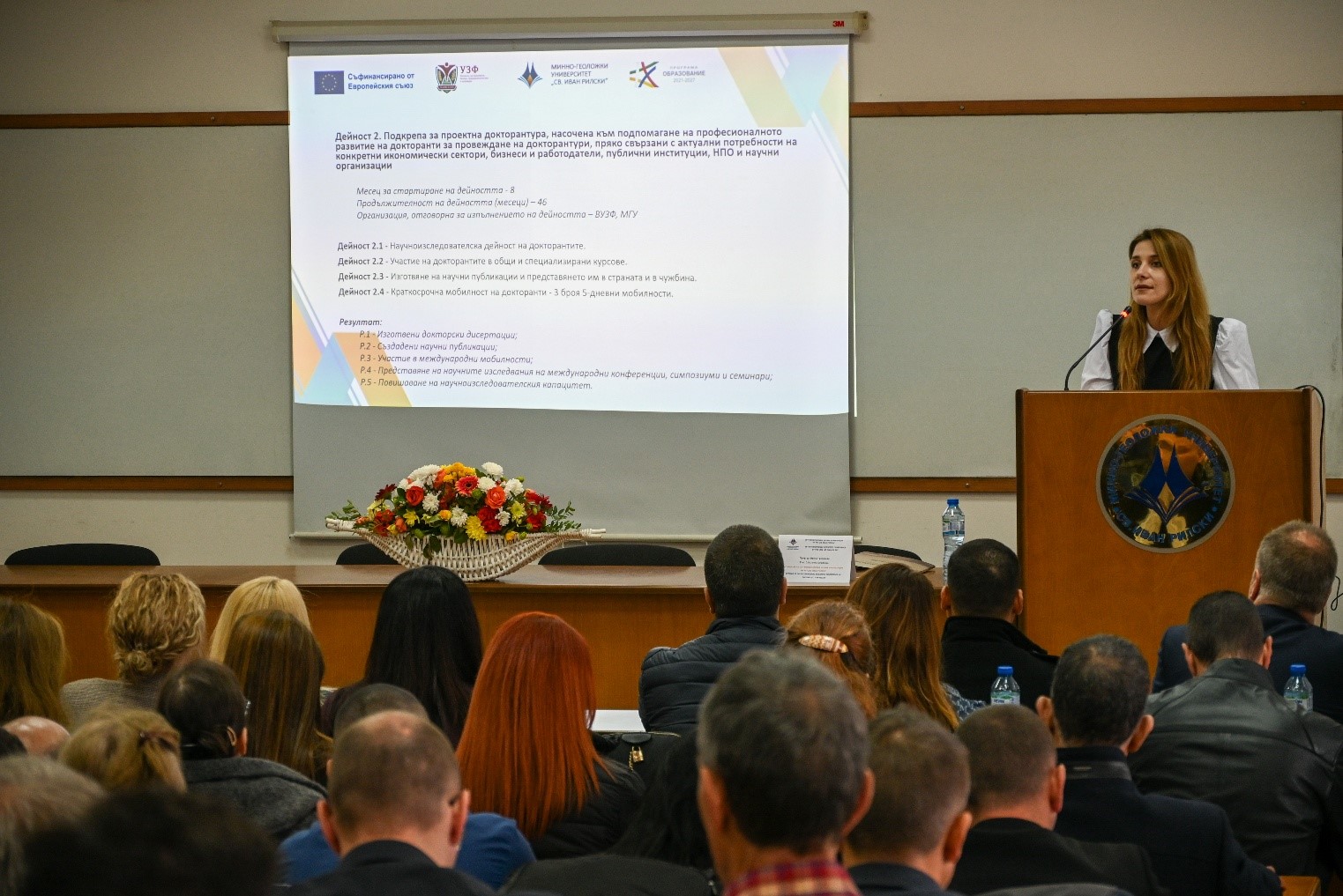 В своята презентация г-жа Андреева обърна специално внимание на идеята за проектната докторантура – модел на обучение, който интегрира научноизследователската дейност с реалните предизвикателства на бизнеса и насърчава иновативното мислене, приложната наука и предприемаческия дух. Тя изтъкна, че проектът има за цел да укрепи връзките между техническите и икономическите науки, да създаде по-гъвкави и адаптивни форми на обучение, както и да повиши научноизследователския капацитет на добивната индустрия – ключов сектор за устойчивото икономическо развитие на България.