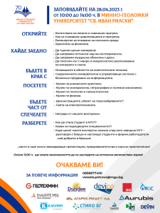 ПРЕССЪОБЩЕНИЕ На 28.04.2023 г. (петък) Минно-геоложки университет „Св. Иван Рилски“ проведе Ден на отворените врати. Традиционното за университета мероприятие, тази година бе част от Юбилейните събития, ознаменуващи 70-тата година от обявяването на МГУ за самостоятелно висше учебно заведение и предизвика истински фурор сред присъстващите. Повече от 1600 ученици от различни...