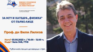 На 03.05.2023 г. проф. дн Вили Лилков (катедра Физика) изнесе публична лекция – част от впечатляващите лекции, които ознаменуват 70-тата година от обявяването на МГУ за самостоятелно висше училище. По емоционален и вдъхновяващ начин, проф. Лилков се върна много назад във времето, разказвайки за корените на катедра „Физика“, отдавайки почит...