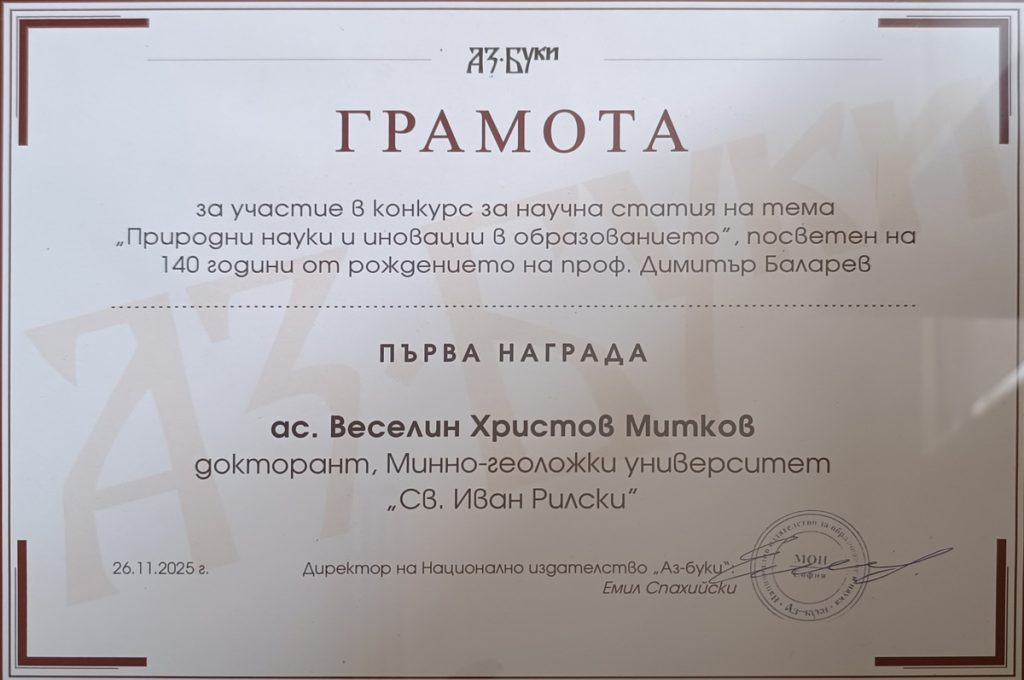 На 26 ноември 2025 г. от 11:00 ч. ас. инж. Веселин Христов Митков, заедно с доц. д-р Лъчезар Георгиев, взе участие в официалната церемония по награждаването на победителите в националния конкурс „Природни науки и иновации в образованието“, посветен на 140 години от рождението на проф. Димитър Баларев. Конкурсът е организиран от Националното издателство за образование и наука „Аз-буки“ и редакционната колегия на списание „Обучение по природни науки и върхови технологии“.