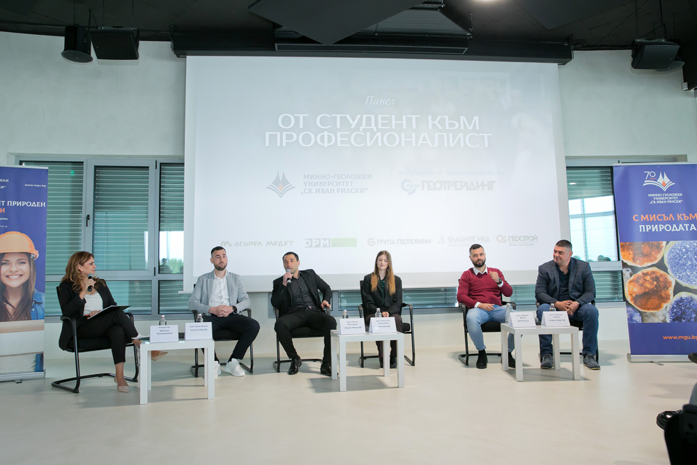Първият панел – „От студент към професионалист“ – даде възможност на млади инженери, възпитаници на МГУ и вече реализирани в практиката, да споделят своя опит от първите стъпки в професията. В него участие взеха представители на водещи компании в сектора – инж. Анастасия Люцканова („Геострой“ АД), инж. Здравко Доков („ДПМ Металс“), инж. Панчо Панчовски и инж. Николай Райчев („Асарел-Медет“ АД), както и инж. Румен Йолов („Елаците-Мед“ АД).