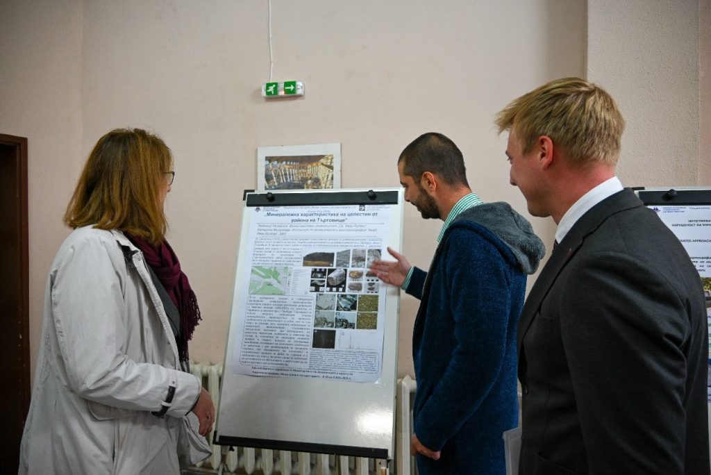 Любомир Янакиев демонстрира изследването си „Минераложка характеристика на целестин от района на Търговище“, което допринася за по-доброто познаване на минералните ресурси в България и тяхното потенциално промишлено приложение.